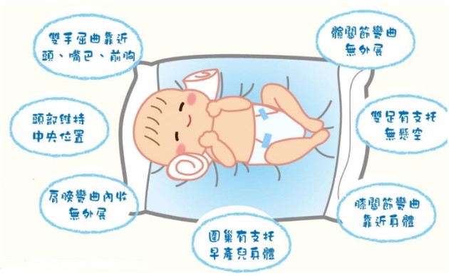 3.使用輔助物擺位:使用小毛巾及捲軸等方式,提供類似子宮內的舒適臥位,可使嬰兒能夠獲得舒適、安全感,穩定生命徵象(呼吸及心跳等),有助生長發育。